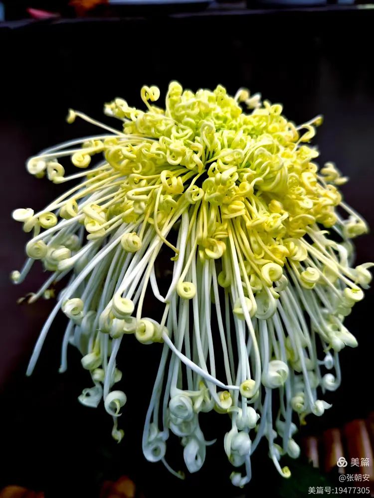 我也蛮喜欢绿颜色的菊花,它形状不少,有松针形状的,有细长花瓣顶端弯曲的,也叫花瓣像牡丹花的叫“绿牡丹”。这朵卷毛狮子头似的也是精品,没挂牌子。以前见过,好像叫“盘龙春晓”。