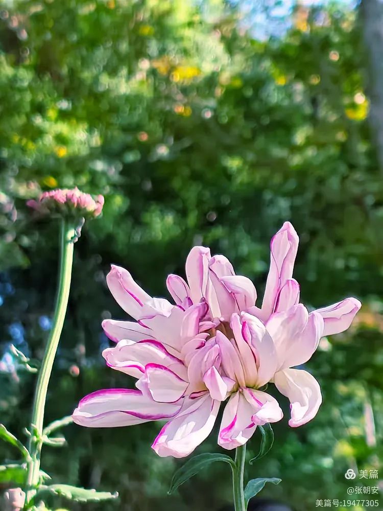 这朵洁白如玉的菊花花瓣上镶着玫瑰红边,花蕊是金黄色的,不知是啥品种。边上端着长镜头相机的,应该也是爱花之人,他说这种品种比较少见。