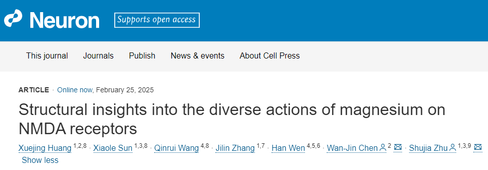 2025年2月25日,《Neuron》期刊在线发表了题为《镁离子对NMDA受体多重调控机制的结构基础》的研究论文,该研究由中国科学院脑科学与智能技术卓越创新中心(神经科学研究所)竺淑佳团队完成。N-甲基-D-天冬氨酸(NMDA)受体作为突触可塑性的关键分子,其功能受镁离子(Mg2+)的电压依赖性阻断与电压非依赖的变构调控,但具体分子机制长期未明。研究团队系统揭示了Mg2+在NMDA受体中的多重作用机制,发现存在三个独立的Mg2+结合位点:位点Ⅰ位于选择性过滤器上——由天冬酰胺形成的环形结构,通过配位键与Mg2+结合,负责经典的电压依赖性阻断功能。位点Ⅱ和Ⅲ则位于GluN2B亚基的N端结构域(NTD),分别介导Mg2+的变构增强与抑制作用。该工作揭示了镁离子在NMDA受体中的多重调控机制,诠释了Mg2+阻断和Ca2+通透的差异性分子机制,为理解NMDA受体在兴奋性突触传递中的功能及其在突触可塑性中的作用提供了新的视角。