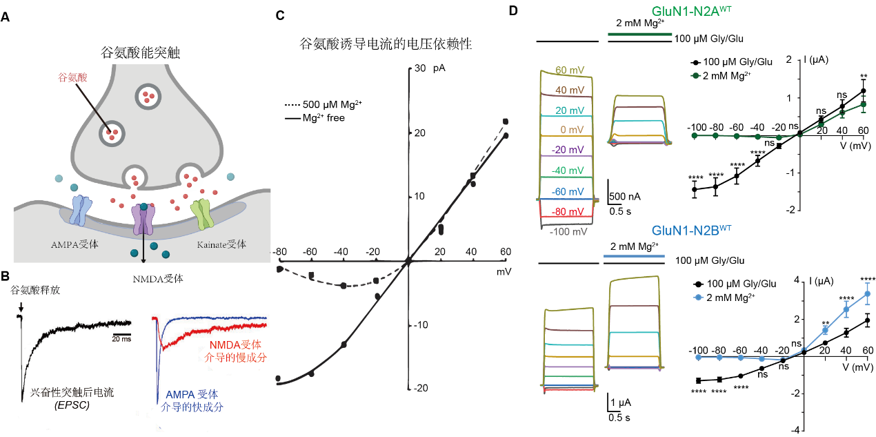 A) 谷氨酸能突触传递的示意图。B) AMPA和NMDA受体介导的EPSC成分(摘自Hansen et al., 2018)。C) 谷氨酸激活受体的I-V curve(摘自Nowak et al., 1984)。D) 电压依赖性Mg2+对GluN1-N2A和GluN1-N2B亚型的不同作用。