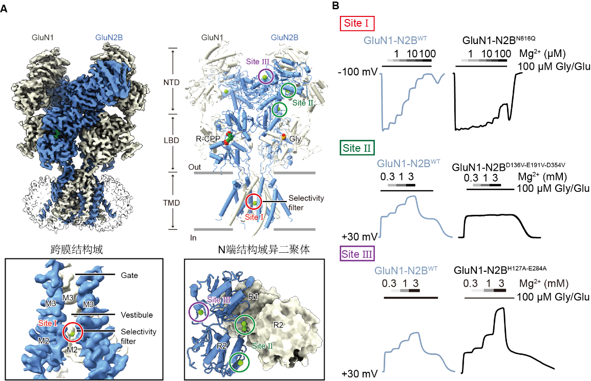 A)Mg2+结合的人源GluN1-GluN2B受体三维结构。B) Mg2+不同作用位点的功能验证。在负电压下,位点Ⅰ点突变显著减弱Mg2+的电压依赖性阻断效应。在正电压下,位点Ⅱ位点突变消除了GluN2B特异性的Mg2+增强效应;位点Ⅲ位点突变进一步提高Mg2+增强作用。