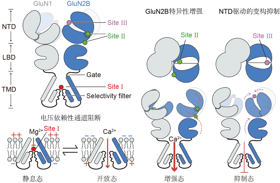 位点Ⅰ位于TMD区域内选择性滤器的顶端,在静息膜电位下通道被Mg2+阻断。这种阻断在膜去极化时得到解除,从而允许Ca2+流入神经元。位点Ⅱ和位点Ⅲ分别位于GluN2B-NTD的两侧,位点Ⅱ参与GluN2B-NTD驱动的变构增强,而位点Ⅲ参与变构抑制作用。