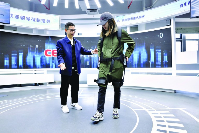 青年报记者体验外骨骼机器人。青年报记者 吴恺 摄