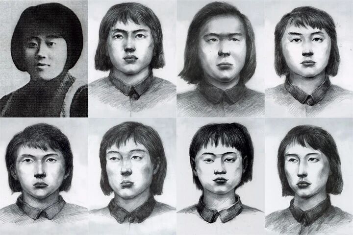 “八女投江”八名女战士的肖像拼版照片:左上为冷云生前照片;其他七名女战士为速写画像,生前未留下照片。新华社发
