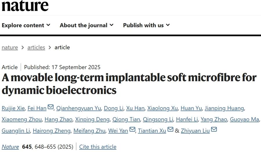 “脑机接口”怎么长期植入?能否柔性移动?9月17日,来自中国科学院深圳先进技术研究院与东华大学的科研团队在国际顶级期刊《自然(Nature)》发文:《面向动态生物电子学的可移动长期植入软纤维》(A movable long-term implantable soft microfibre for dynamic bioelectronics)。这一重大突破宣告,中国科学家团队成功研发出智能纤维——“神经蚯蚓”,可在体内自由游走,大面积、跨区域精准监测神经电信号,及组织微小形变。