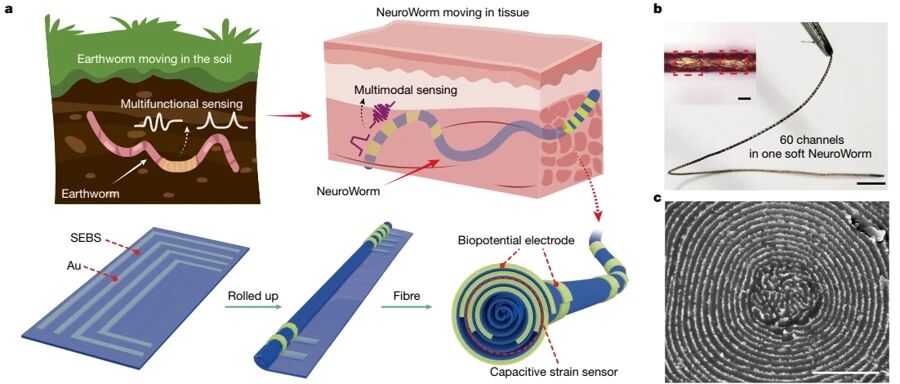 大自然中,蚯蚓凭借独特的“体节”结构(metamerism),实现了高度分布式的感知与运动控制能力。每一节体段中都布有离散的感知与神经单元,能够精准地感知外界刺激并灵活响应,展现出在复杂环境中自由穿行的非凡适应性。正是从这一自然设计中汲取灵感,中国科学院深圳先进技术研究所的刘志远研究员联合严威研究员团队设计出NeuroWorm——一种仿蠕虫结构的动态、柔软、可拉伸的纤维神经接口。