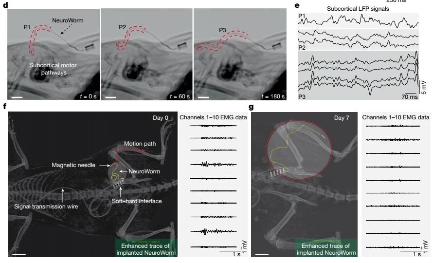 最关键的是“学会游走”:研究人员联合中国科学院深圳先进技术研究院的徐天添研究员团队,创新性地引入开放式磁控策略,实现了“神经蚯蚓”NeuroWorm在组织内的初步可控推进与转向,使其在体内“听话”地游走。实验视频中,这根透明纤维如蚯蚓穿梭泥土般,从实验小白鼠体内的一个区域移动到另一区域,沿途留下清晰的神经信号记录,全程无需二次手术。纤维的能动性,得益于“磁控”黑科技。严威解释道,“它就像一个微缩机器人在大脑和肌肉中漫游,全程无创,对人体无害。”