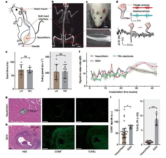 其更深远的价值在于“长期监测”能力。在动物实验中,研究团队通过极小的切口,将NeuroWorm植入大鼠肌肉,连续记录稳定的生理信号超过43周,且在植入54周后仍未引发明显的组织反应或纤维化包裹,展现出在同类器件中极为罕见的长期稳定性和生物相容性。