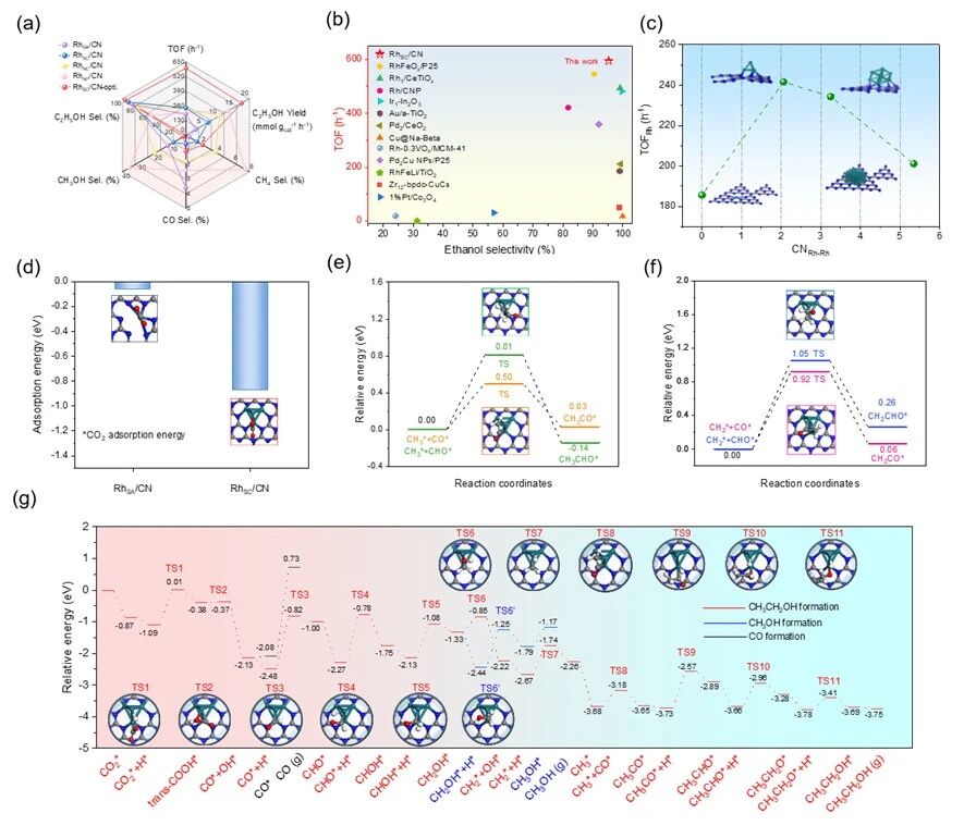 近期,研究团队创制了具有单团簇结构的RhSC/CN催化剂,克服了纳米颗粒催化剂上活性金属原子利用率较低以及单原子催化剂上反应效率不高等问题,有效提升了CO2加氢制乙醇的选择性和乙醇产率。研究发现,该催化剂上活性金属主要以单团簇形式存在,具有近原子级分散度和对反应物分子较强的吸附活化能力。反应条件经过优化后,该催化剂上展现出了最高的乙醇选择性和乙醇产率,分别为95.3%和17.5 mmol/gcat/h,其上转换频率TOF值高达595.2 h⁻1。原位红外表征证实,该催化剂上特有的单团簇结构能有效促进碳碳偶联反应和关键中间体生成。理论计算阐明了催化剂单团簇活性位上CH3*和CO*反应中间体进行碳碳偶联具有最低的反应能垒,并揭示了乙醇生成的最优反应路径。该工作为同时促进CO2转化和乙醇选择性生成的单团簇催化剂的设计提供了新的见解,为实现高效CO2加氢制绿色乙醇提供了一条有应用前景的途径。