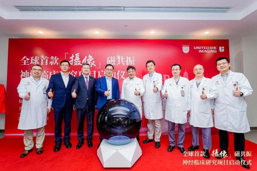 华山医院院长毛颖、华山医院党委副书记顾宇翔、华山医院虹桥院区执行院长赵曜、华山医院放射科主任姚振威、联影集团董事长薛敏、联影医疗全球市场部总裁/中国业务总裁缪宏、联影医疗磁共振事业部总裁李国斌出席“全球首款‘摄像’磁共振神经临床研究项目”启动仪式。