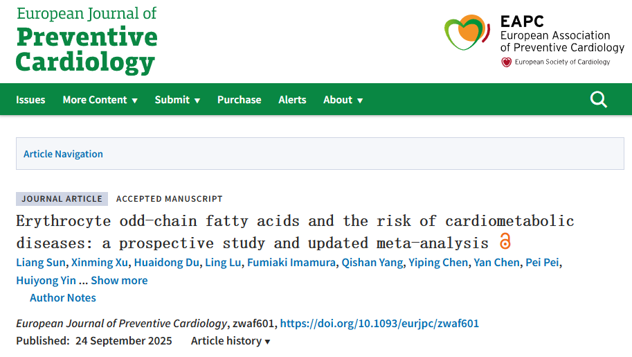 中国科学院上海营养与健康研究所林旭团队与“中国慢性病前瞻性研究”(China Kadoorie Biobank, CKB)团队合作,于9月24日在European Journal of Preventive Cardiology期刊上发表了题为“Erythrocyte odd-chain fatty acids and the risk of cardiometabolic diseases: a prospective study and updated meta-analysis”的文章。该研究首次系统探讨了奇数碳脂肪酸在我国10个地区的膳食来源,及其与心血管代谢性疾病(包括缺血性心脏病、糖尿病及卒中)发病风险的关联关系,并通过荟萃分析整合了14个国家共34项前瞻性研究进行了验证。