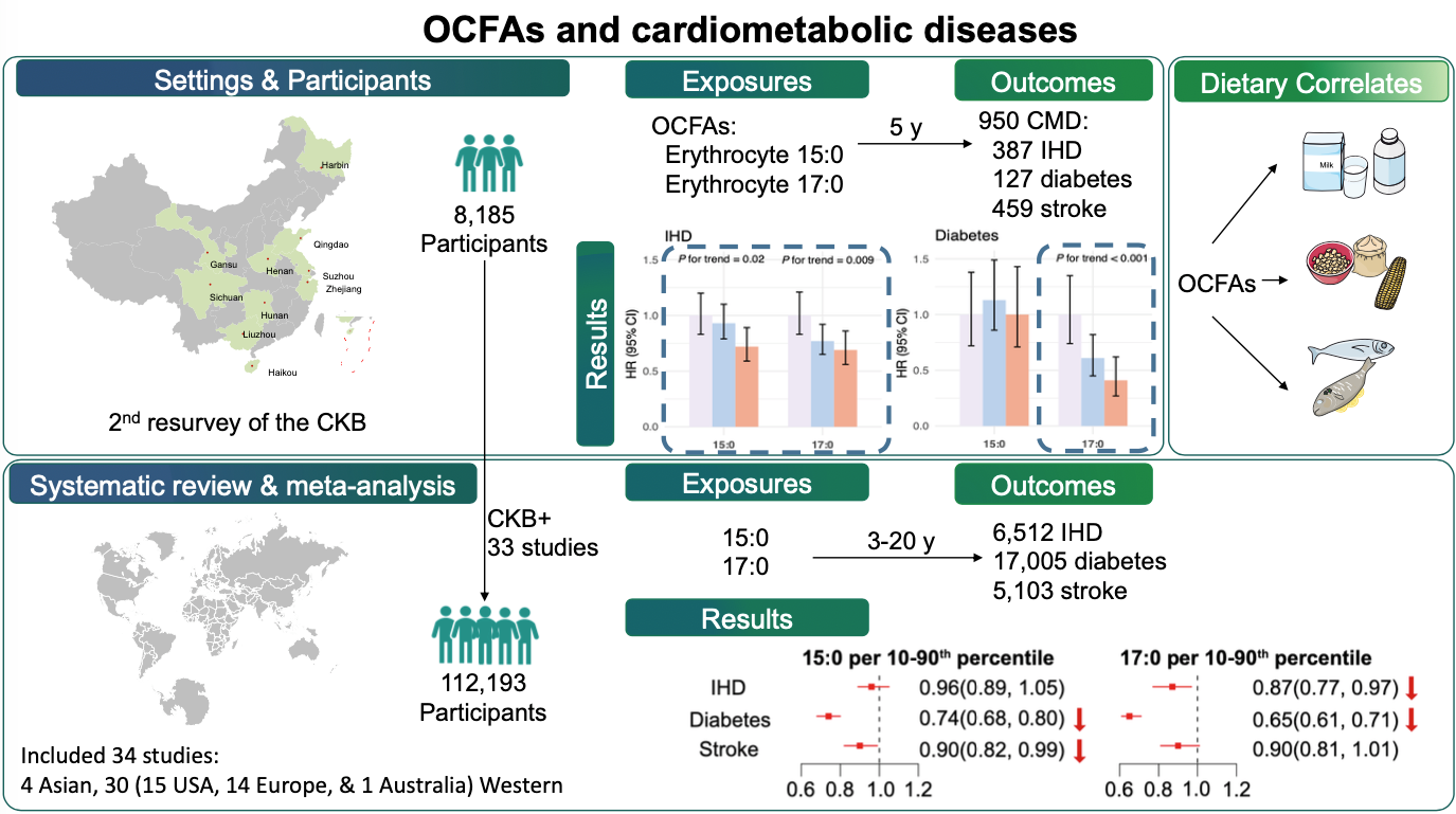 图:基于中国慢性病前瞻性研究(China Kadoorie Biobank, CKB)和全球最新荟萃分析,发现两种主要奇数碳脂肪酸(Odd-Chain Fatty Acids, OCFAs)对心血管代谢性疾病风险呈现保护性关联作用。