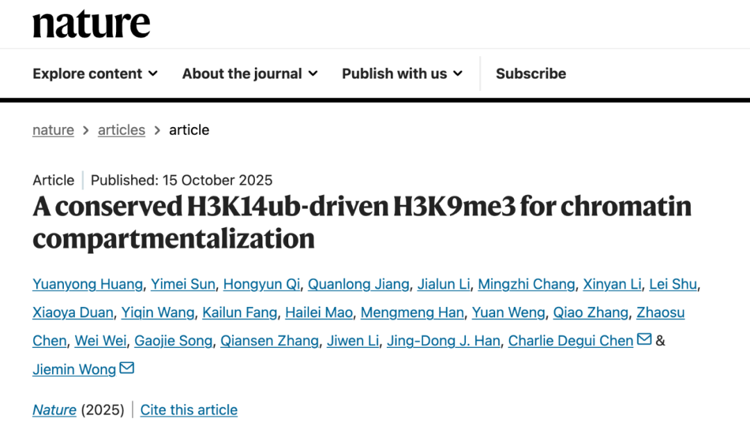 北京时间10月15日23时,华东师范大学翁杰敏教授团队与中国科学院生物化学与细胞生物学研究所陈德桂研究员团队合作,在国际顶级期刊《自然》上发表题为 “A conserved H3K14ub-driven H3K9me3 for chromatin compartmentalization” 的研究成果,首次揭示了一种在哺乳动物细胞中控制染色质分区以及近着丝粒异染色质形成、维持和稳态遗传的新机制。