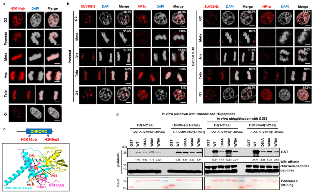 研究显示,G2E3作为“先锋因子”在有丝分裂早期即定位到近着丝粒区域,通过催化H3K14ub“标记”招募SUV39H1/2,进而促进H3K9me3修饰的建立和异染色质结合蛋白HP1的招募,形成完整的调控环路,确保异染色质结构在细胞分裂过程中的准确传承。
