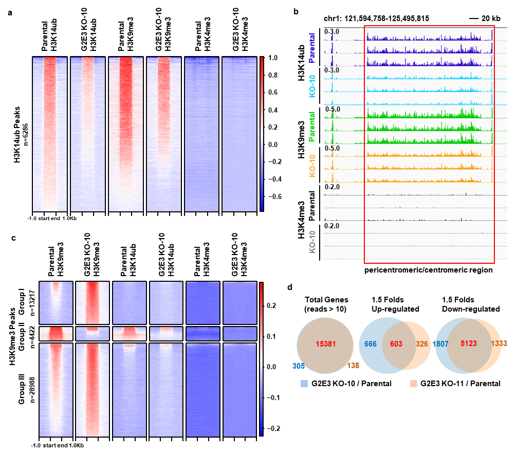 令人惊喜的是,该调控机制的影响远不止于异染色质区域。研究发现,G2E3的缺失不仅损害了近着丝粒异染色质的结构,还导致SUV39H1/2和H3K9me3在常染色质区域的异常积累,引发广泛的转录抑制。