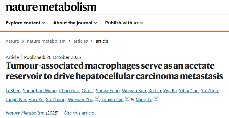 10月20日,国际学术期刊Nature Metabolism在线发表了中国科学院上海营养与健康研究所鲁明研究组的合作研究成果,题为“Tumor-associated macrophages serve as an acetate reservoir to drive hepatocellular carcinoma metastasis”。该研究报道了肿瘤相关巨噬细胞(Tumor-associated macrophages, TAMs)与肝癌细胞之间“乳酸-脂质过氧化-乙酸”的全新代谢互作模式,揭示了TAMs作为微环境乙酸供应源,通过增加肝癌细胞乙酰辅酶A(acetyl-CoA)合成,促进肝癌转移的作用机制,为肝癌转移提供了潜在的微环境干预靶点。