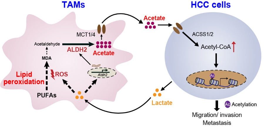 鲁明研究组一直致力于脂质代谢物的细胞感知及其调控癌转移的病理机制研究。为了寻找肝癌微环境中乙酸的来源,研究人员首先对肝癌微环境中不同的原代免疫细胞和基质细胞进行筛选,并利用体内清除实验和体外诱导的TAMs进行分析验证,鉴定出TAMs可特异性促进肝癌细胞乙酸水平的提高,并证实TAMs是通过分泌游离形式的乙酸到微环境中来实现这种特异性效应。进一步的机制研究发现,TAMs中脂质过氧化-乙醛脱氢酶2(ALDH2)途径是调控其乙酸生成和分泌的关键代谢途径。