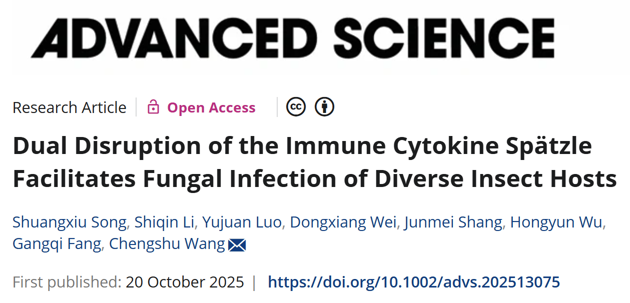 2025年10月20日,Advanced Science期刊在线发表了中国科学院分子植物科学卓越创新中心王成树研究组题为“Dual Disruption of the Immune Cytokine Spätzle Facilitates Fungal Infection of Diverse Insect Hosts”的研究论文,揭示了绿僵菌通过双效应子挟持昆虫寄主免疫的关键细胞因子而广谱杀虫的作用机制。
