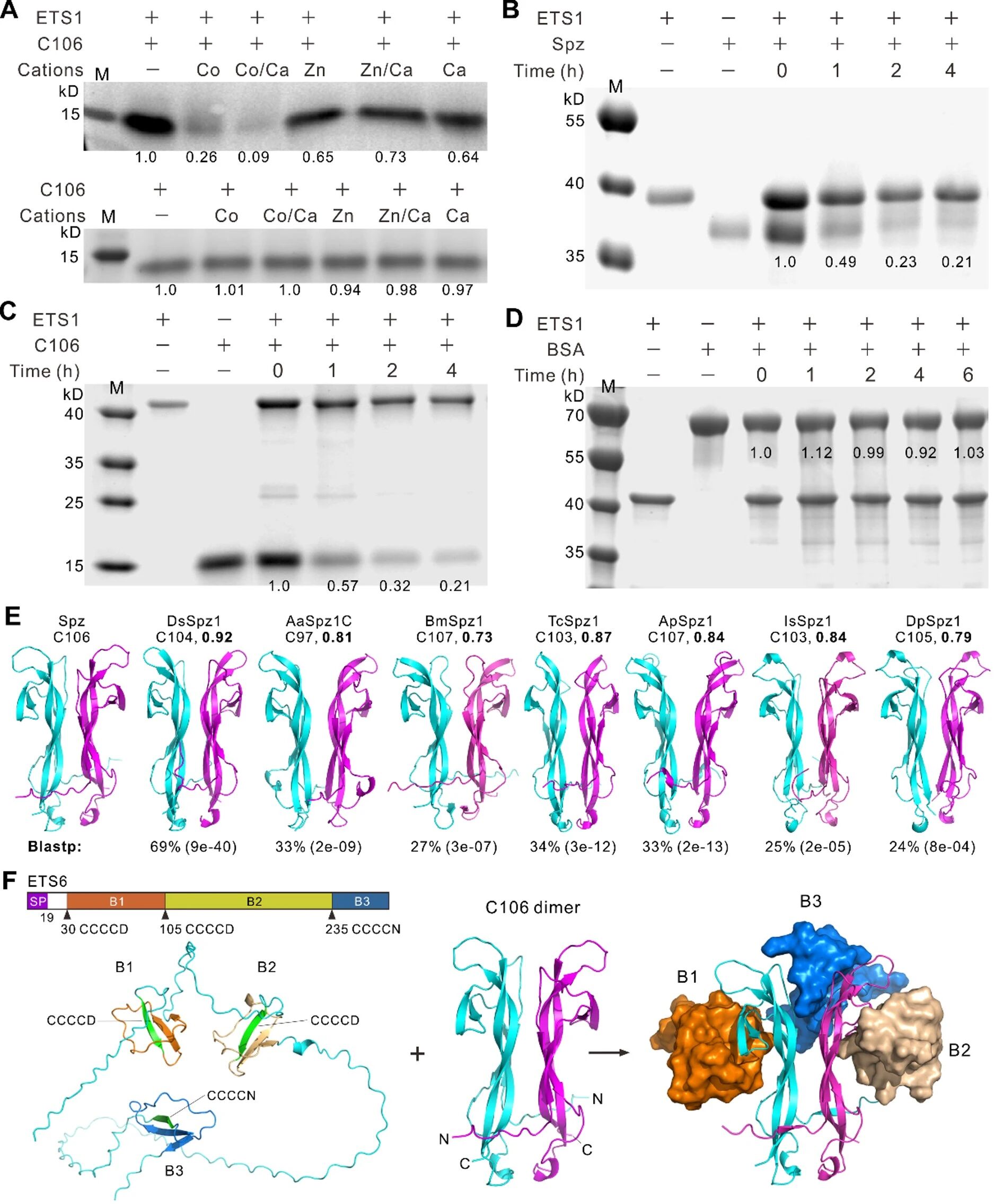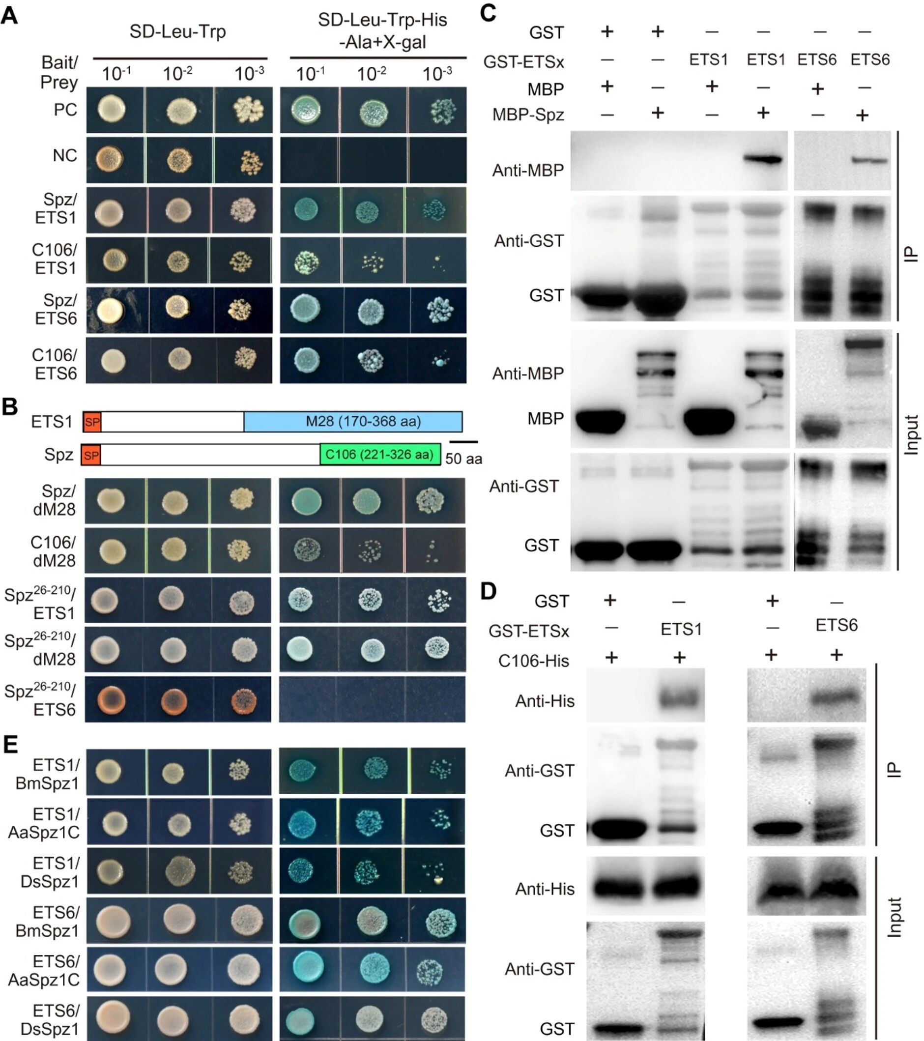 昆虫抗真菌免疫应答主要为Toll信号途径,其中跨膜Toll受体的特异性配体Spätzle是介导胞外免疫识别信号到胞内应答、表达抗菌肽的关键细胞因子,其成熟形式为C-末端的106个氨基酸(C106),通过形成二聚体与Toll受体结合。基于病原菌—宿主“军备竞赛”(arms race)式互作理论,他们使用 果蝇Spätzle蛋白为诱饵,筛选罗伯茨绿僵菌感染昆虫不同时期构建的cDNA文库,获得9个潜在的互作蛋白ETS1-9。