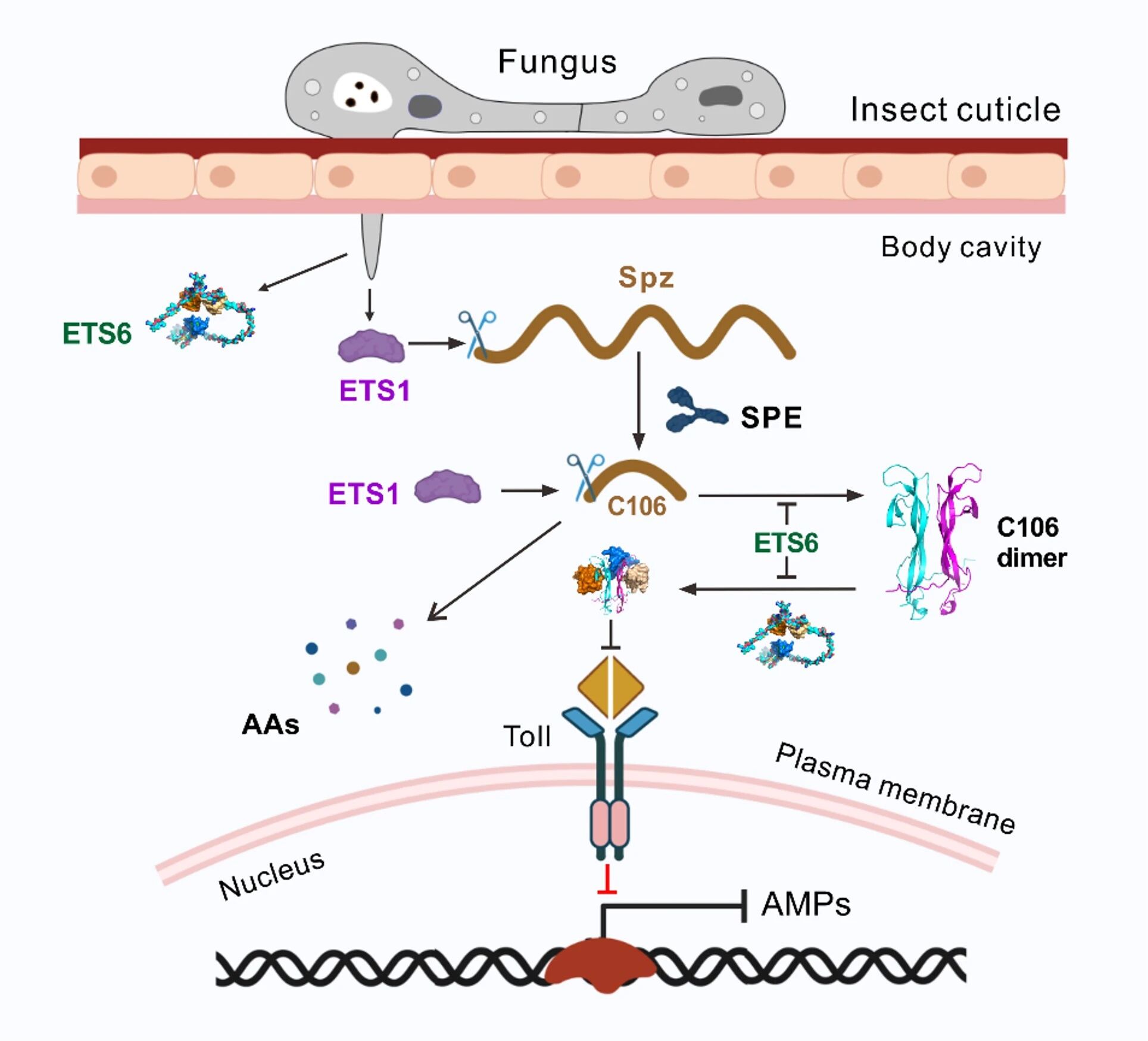 进一步通过酵母细胞的正反向双杂,以及蛋白水平的互作验证,证明绿僵菌M28家族的金属蛋白酶ETS1和功能未知的ETS6同Spätzle及C106均存在互作。生化功能等验证表明,氨肽酶ETS1可降解Spätzle和C106;昆虫免疫应答可上调、“补偿”表达Spätzle,但ETS6可阻止C06二聚化,又可挟持、阻止C106二聚体同Toll受体结合,从而显著抑制抗菌肽表达。有意思的是,不同昆虫的Spätzle/C106氨基酸序列高度分化,但不同昆虫甚至非昆虫无脊椎动物的C-末端成熟配体形成结构高度相似的二聚体结构,ETS1和ETS6可同样作用于不同昆虫的免疫配体,从而表现出广谱杀虫活性。