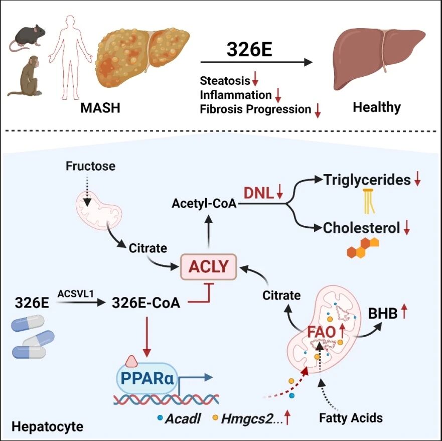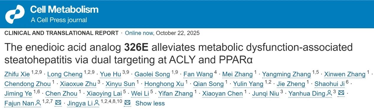 2025年10月22日,中国科学院上海药物研究所李静雅研究员、南发俊研究员团队与吉林大学第一医院丁艳华教授团队联合在 Cell Metabolism 在线发表题为 “The enedioic acid analogue 326E alleviates metabolic dysfunction–associated steatohepatitis via dual targeting at ACLY and PPARα” 的研究论文。该成果系统揭示了研究团队自主研发的候选药物 326E(又名BGT-002) 的作用机制与临床前、临床验证结果,为MASH治疗提供了新的思路。