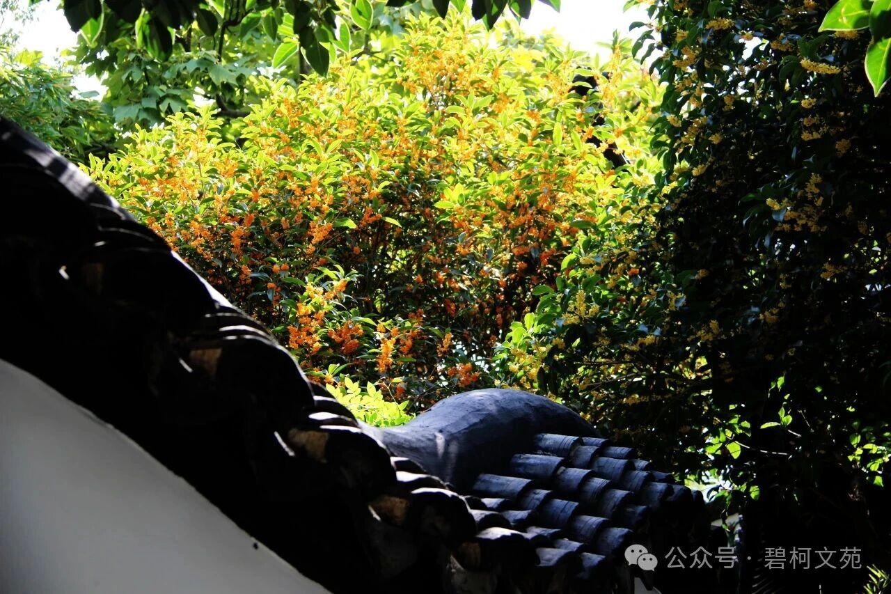 四教厅前的丹桂林最是惹眼。橙红的花瓣在阳光下泛着珊瑚色光晕,与粉墙黛瓦相映成趣。摄影爱好者架着长枪短炮,追拍花瓣间穿梭的蜂蝶,镜头一转,又定格下穿汉服的姑娘——她正抬手接住飘落的花瓣,发间银簪与丹桂同色。“这是‘状元红’,往年要等霜降才开,今年和金桂凑一块儿了。”戴眼镜的老者指着树牌科普,牌上“23 个品种 1000余株”的字样,被阳光晒得暖融融的。