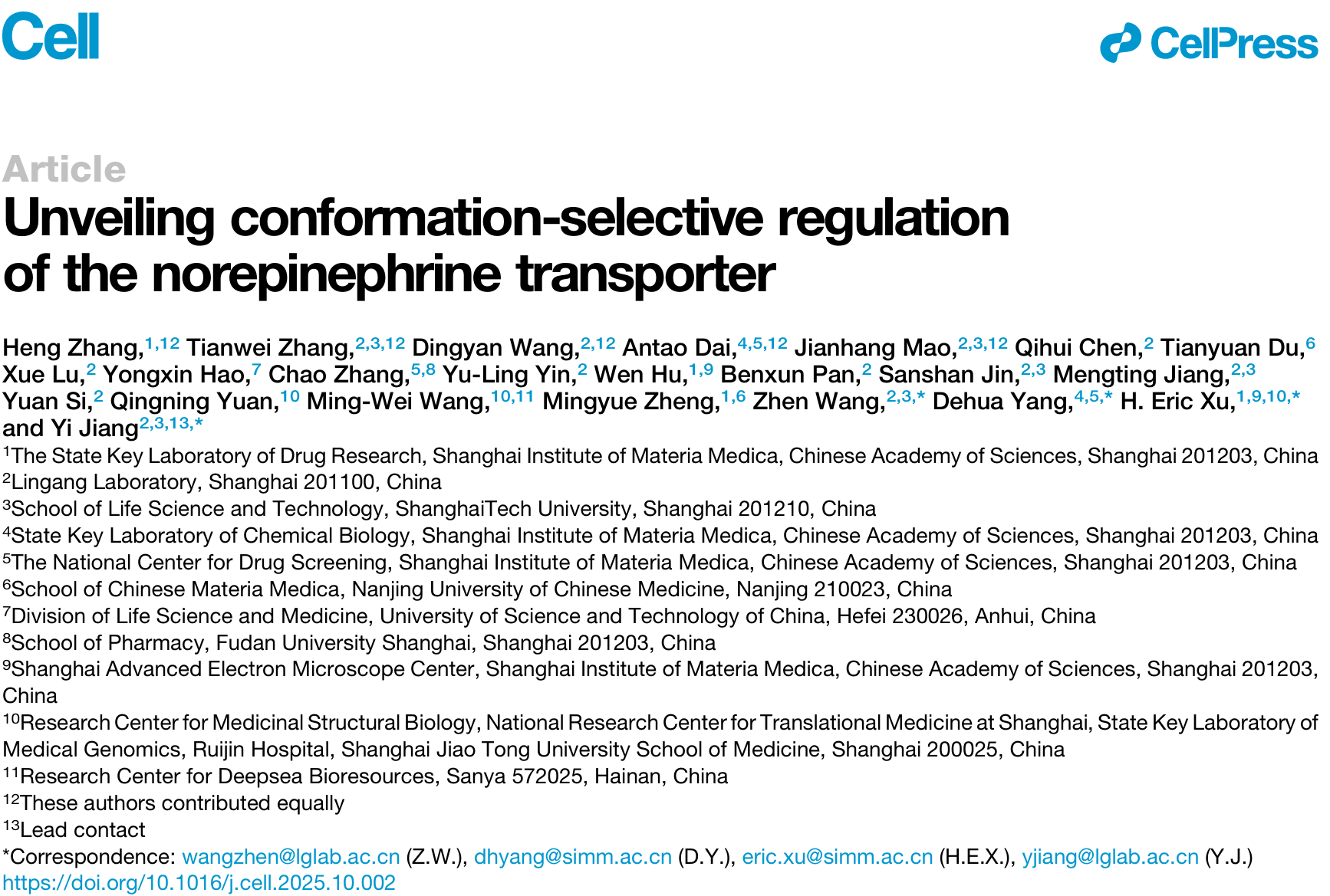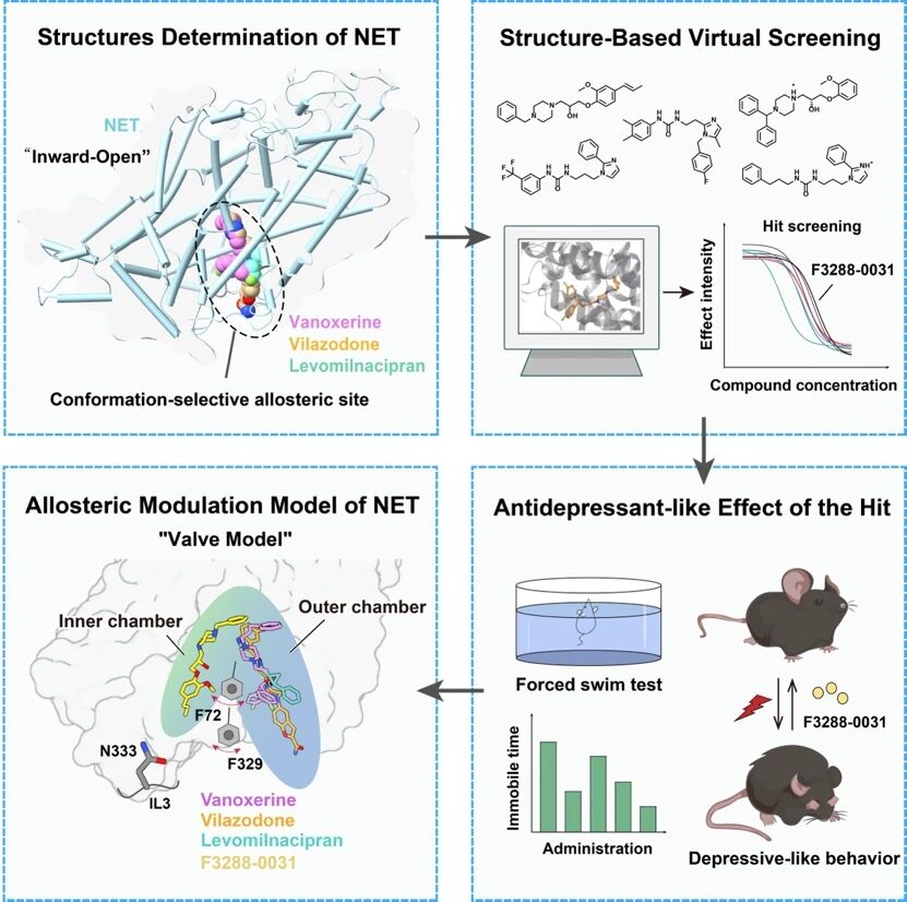 继在《Nature》(2024)上首次揭示NET同源二聚化机制及抗抑郁药物识别机制后,2025年10月24日,中国科学院上海药物研究所徐华强研究员、杨德华研究员团队,联合临港实验室蒋轶研究员、王震研究员团队,在《Cell》上在线发表了题为“Unveiling conformation-selectivity regulation of the norepinephrine transporter”的研究论文。该研究鉴定了NET内向开放构象特异性的变构位点,提出了靶向该构象的阻断剂识别新机制——“瓣膜模型”。基于该模型,研究团队采用“干–湿”结合的研究策略,发现了具有体内外抗抑郁活性的小分子,并通过结构药理学手段阐明了其结合模式。该成果为理解NET及其他单胺类转运体的配体调控机制奠定了重要的结构基础,也为开发靶向单胺转运体的抗抑郁等神经精神疾病药物提供了新思路。