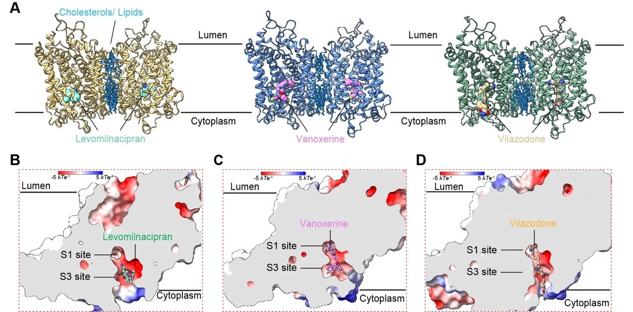 研究团队解析了人源NET分别与抗抑郁药物左米那普仑、维拉佐酮,以及NET与多巴胺转运体双重再摄取抑制剂伐诺司林结合的三个冷冻电镜结构,分辨率达2.44–2.52 Å(图1A)。研究显示,三种复合物中NET均呈现内向开放构象。左米那普仑结合于一个NET内向开放构象特异的新型变构位点(图1B)。该位点被命名为S3,以区别于中央正构位点S1和位于靠近胞外区的外向开放构象变构位点S2。与之不同,维拉佐酮和伐诺司林则同时占据S1与S3位点(图1C, D)。