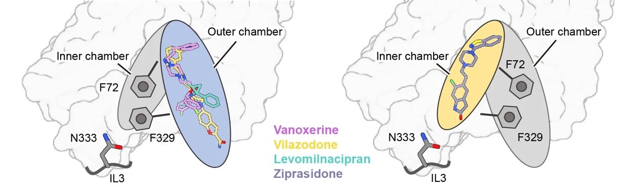 通过对三个复合物结构的精细分析,与已报道的齐拉西酮–NET复合物进行结构比较(PDB:8WTY),并结合分子对接结果,研究团队提出了NET抑制剂识别的“瓣膜模型”:NET内向开放空腔中的两个关键苯丙氨酸残基F72和F329如同“心脏瓣膜”,其侧链相对排列,且侧链构象随不同抑制剂的结合而发生改变。这两个残基将内向开放空腔分隔为内室与外室两个非对称区域。不同化学结构(如线性或非线性、体积与长度)的抑制剂被“瓣膜”引导结合至不同区域:左米那普仑、维拉佐酮和伐诺司林结合于外室,而齐拉西酮则结合于内室(图2)。该模型揭示了NET如何特异性识别结构多样的抑制剂,为理性药物设计提供了新的理论框架。