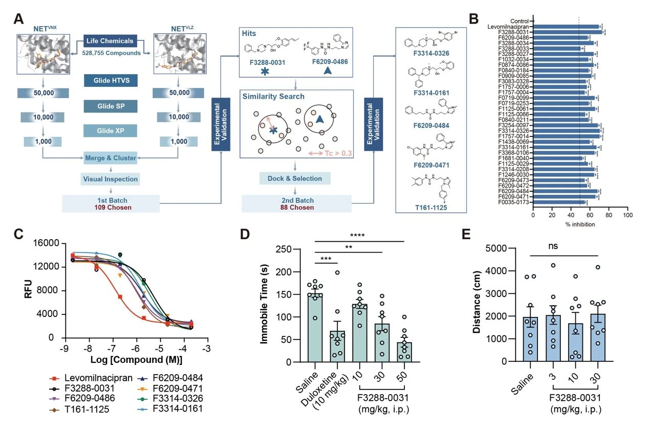 基于上述结构模型,研究团队对包含超过52万种小分子的化合物库进行了针对NET内向开放构象的虚拟筛选。经过多轮筛选与生物学验证,最终获得活性化合物F3288-0031(图3A-C)。该化合物在体外表现出强效的NET抑制活性,并在小鼠强迫游泳实验中显示出明确的抗抑郁样效果,且未影响自发活动(图3C-E)。