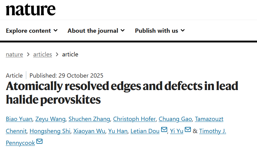 近日,上海科技大学物质科学与技术学院于奕课题组与比利时安特卫普大学、美国普渡大学科研团队合作,在辐照敏感材料的电子显微成像研究中取得突破性进展,利用低剂量电子显微成像方法揭示了卤化物钙钛矿材料的表面边缘和内部缺陷的原子结构。北京时间10月29日,相关研究成果以“Atomically Resolved Edges and Defects in Lead Halide Perovskites”为题,在线发表于国际学术期刊《自然》(Nature)。