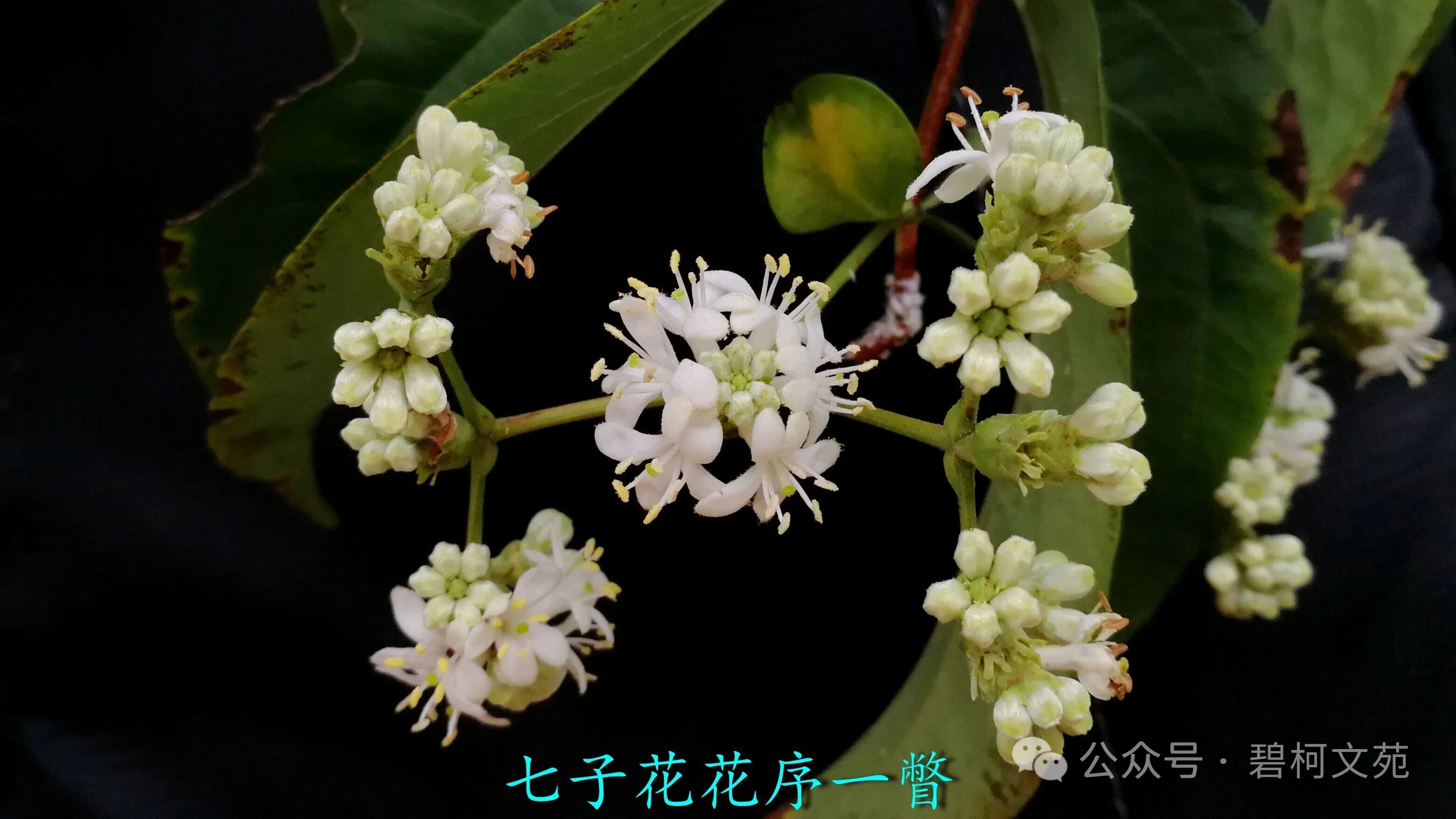 屏住气息,仔细观察,发现中间那朵“花”实际上是处于生殖生长期的茎尖,换言之是正在发育中的小花序。随着发育,小花序可以不断开花并再次形成6朵花围住一朵“花”的样子,多开几轮,小花序将变成一座小花塔。但生殖期茎尖不会无限生长,那么停止生长前的最后一轮可能就是6朵花围住一朵顶生花,真正的七子花!可惜树太高了,无法逐枝逐条去寻找真正的“七子花”。留个遗憾吧!以后再次观赏七子花时有个好由头。
