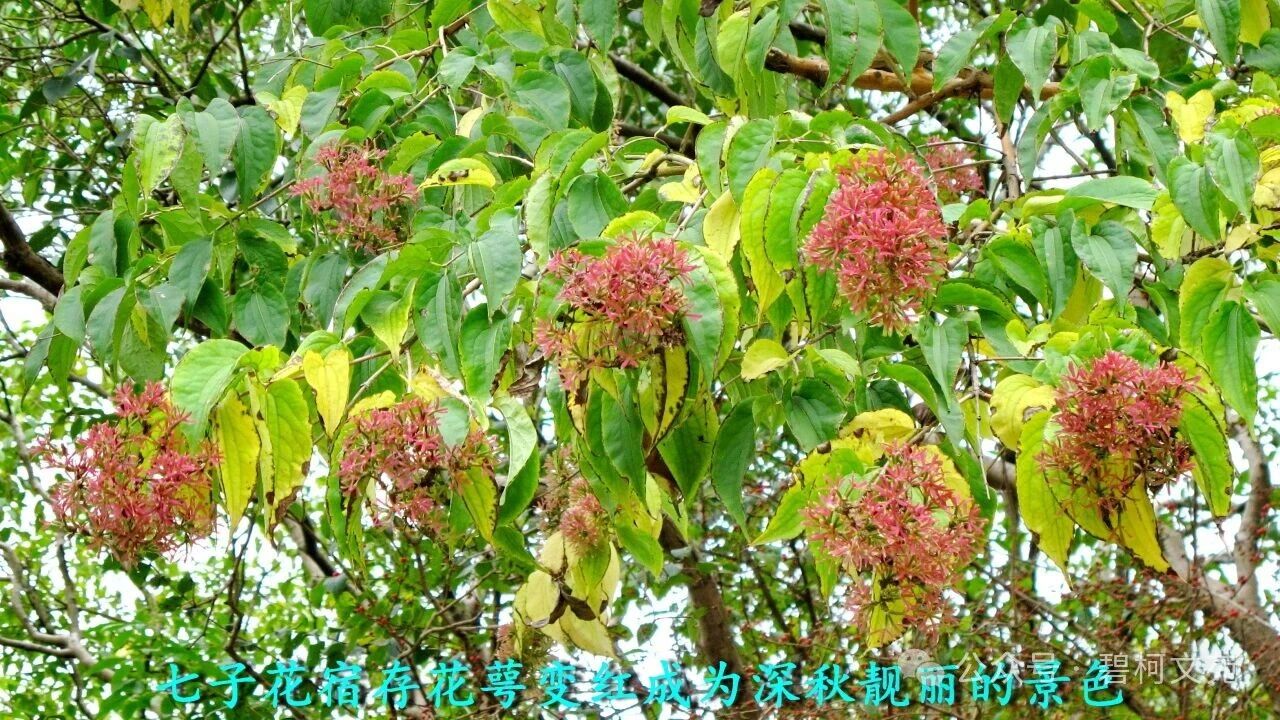 实地观赏过七子花,再次阅读植物园的科普文章,一个细节让我再次惊叹。根据植物园的科普文章介绍,七子花外围的花环实际上是由两个各具3朵花的小聚伞花序围成的。树下有被大风吹落的花序,捡起来细细察看:花环果然是由两个小花序组成。两个小花序不高不低,不偏不倚,间隔匀称,围成一个完美无缺的花环,大自然的造物水平确实让人惊叹!科普文章还特别介绍,花儿凋谢后,叶状副萼片宿存,并继续膨大,颜色转为紫红色,远远望去,好似一树红花,让七子花二次展示迷人风采。果然,深秋的七子花披红挂绿,俨然是一道靓丽的风景线。
