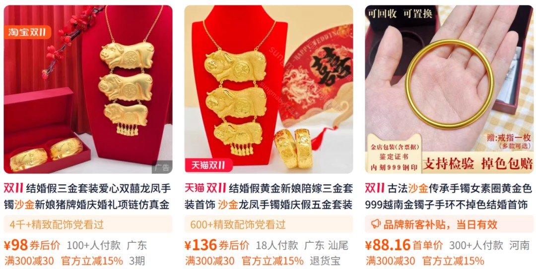 网上经常能看到卖“沙金”首饰的直播和视频。有些商家说,这些首饰和黄金一样,不掉色、不怕火,价格却只要几十块到一百多块。