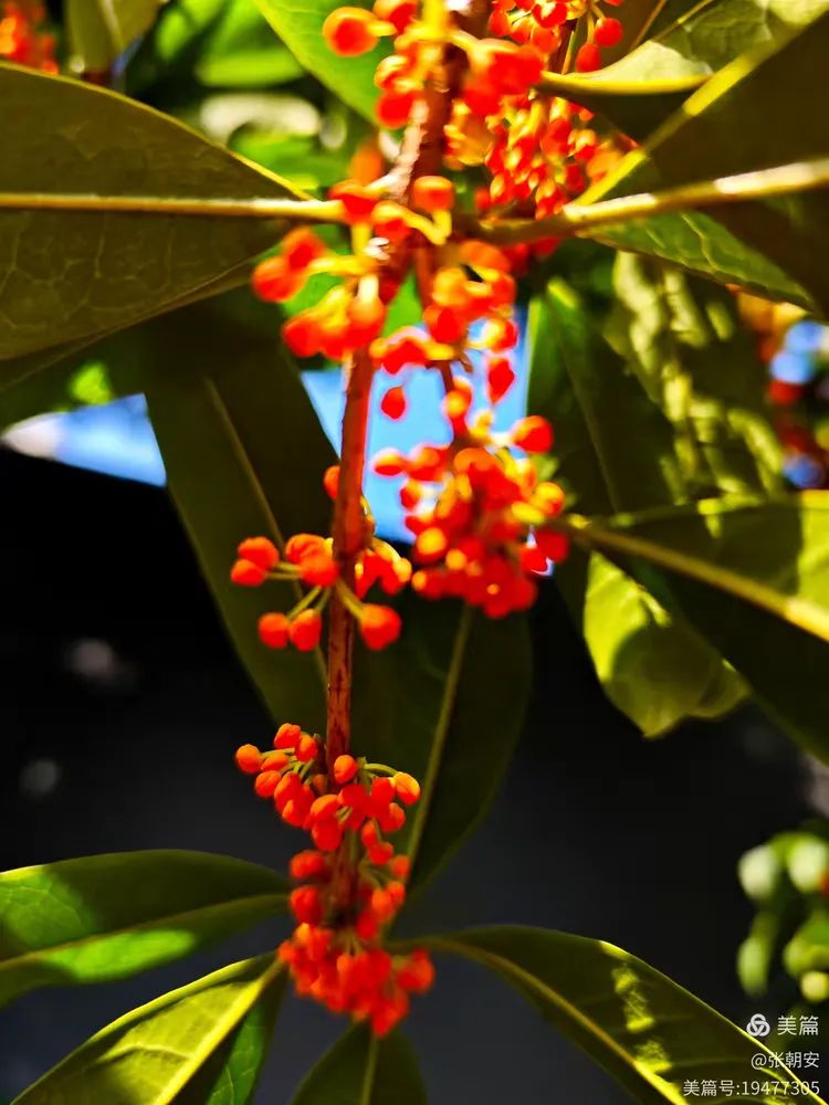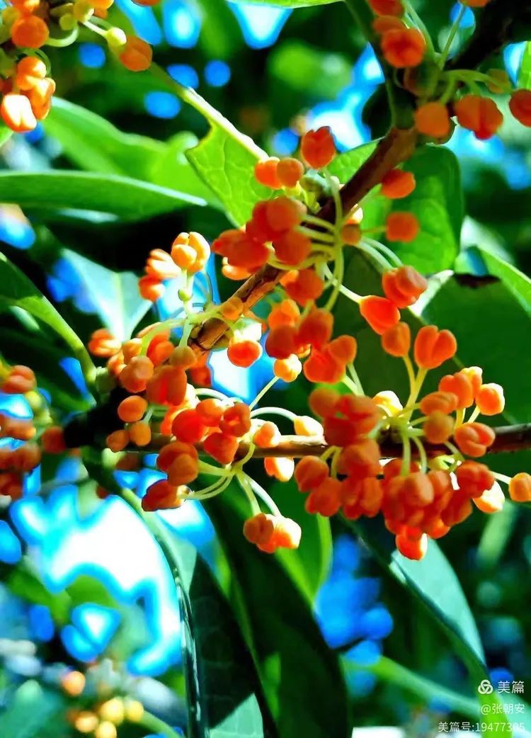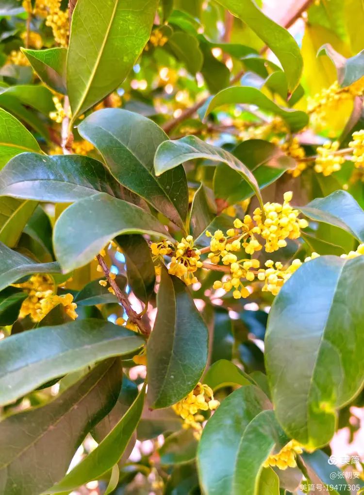 其实,桂花是很低调的,一粒粒小米粒似的,挤在一起挂在碧绿的枝头,花容一点都不张扬。每朵桂花都宛如小精灵,在翠绿欲滴的叶间舞动着生命的旋律。桂花的色彩也不多,我见过淡黄、金黄、铁锈红的。阳光下,小小的花儿晶莹剔透、熠熠生辉,为秋天增添了一道绚丽多彩的风景线。