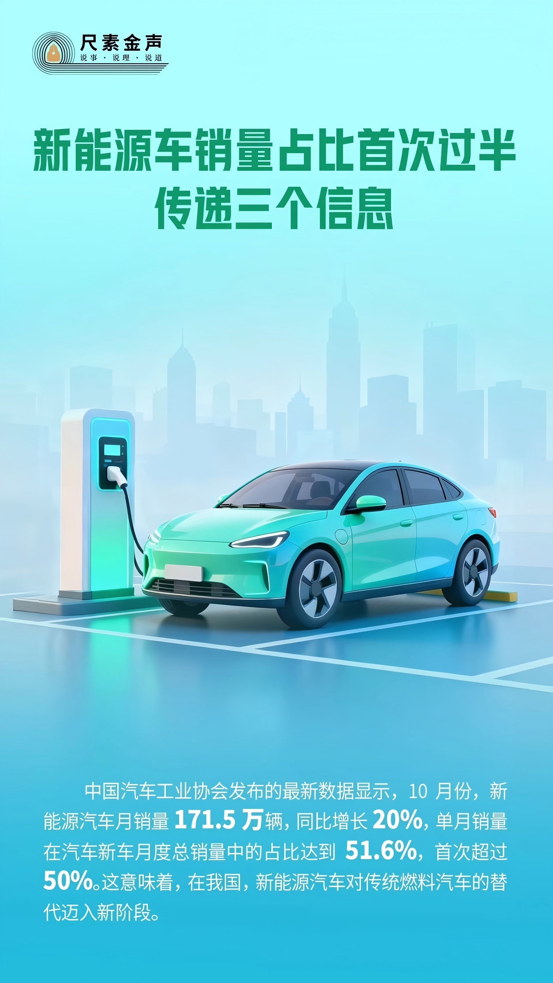 中国汽车工业协会发布的最新数据显示,10月份,新能源汽车月销量171.5万辆,同比增长20%,单月销量在汽车新车月度总销量中的占比达到51.6%,首次超过50%。这意味着,在我国,新能源汽车对传统燃料汽车的替代迈入新阶段。