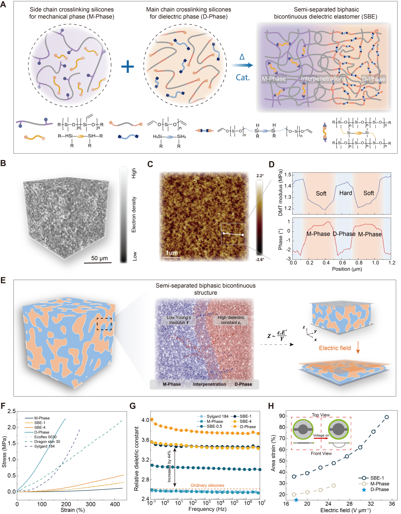 该策略利用了两种硅橡胶不同的交联机制,通过其异交联动力学的差异,引导两相在微米尺度自发组装。其中高介电常数的介电(D)相通过主链交联形成贯穿网络,而低杨氏模量的机械(M)相通过侧链交联构成力学骨架,形成边界融合、相互贯通的双相结构。这种微观结构既保持了材料的低杨氏模量,同时提高了其介电常数和击穿电场。实验表明,仅含10%D相的SBE材料,其杨氏模量约为10 kPa,相对介电常数为3.6,实现了高的机电灵敏度。基于此材料制备的人工肌肉,在无需预拉伸的情况下,在35 V/μm的电场下实现了90%的面积应变。
