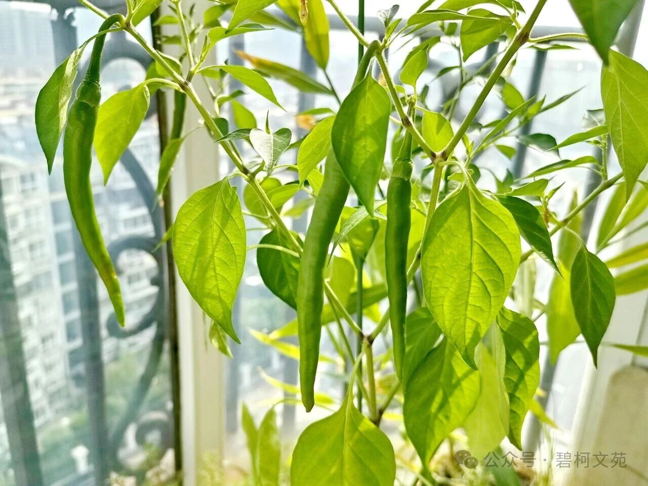 由于我家朝南的阳台在夏天阳光照不进来,辣椒苗第一次开花却未能座果。显然是阳光不足的原因,赶紧搬到夏天阳光多一点的北阳台。当枝条上出现幼嫩的小辣椒时,真让人开心!长着长着,小辣椒长成线条形的尖辣椒,而不是期待中的观赏椒——五色椒!这粒尖辣椒种子是如何跑到花圃里的呢?这是一个解不开的迷啊!