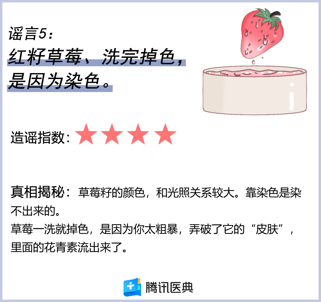 染色染不出草莓的红,但阳光可以,光照越充足,草莓就越红,部分草莓籽也会跟着变成红色。“白屁股”草莓也是一样的道理,它们往往是在“青春期”果蒂还没变红的时候就被摘下来了,因为熟过头的草莓很难保存,洗草莓时掉色,因为草莓富含花青素,稍一用力,花青素就可能跑出来了,溶到水里变成红色。