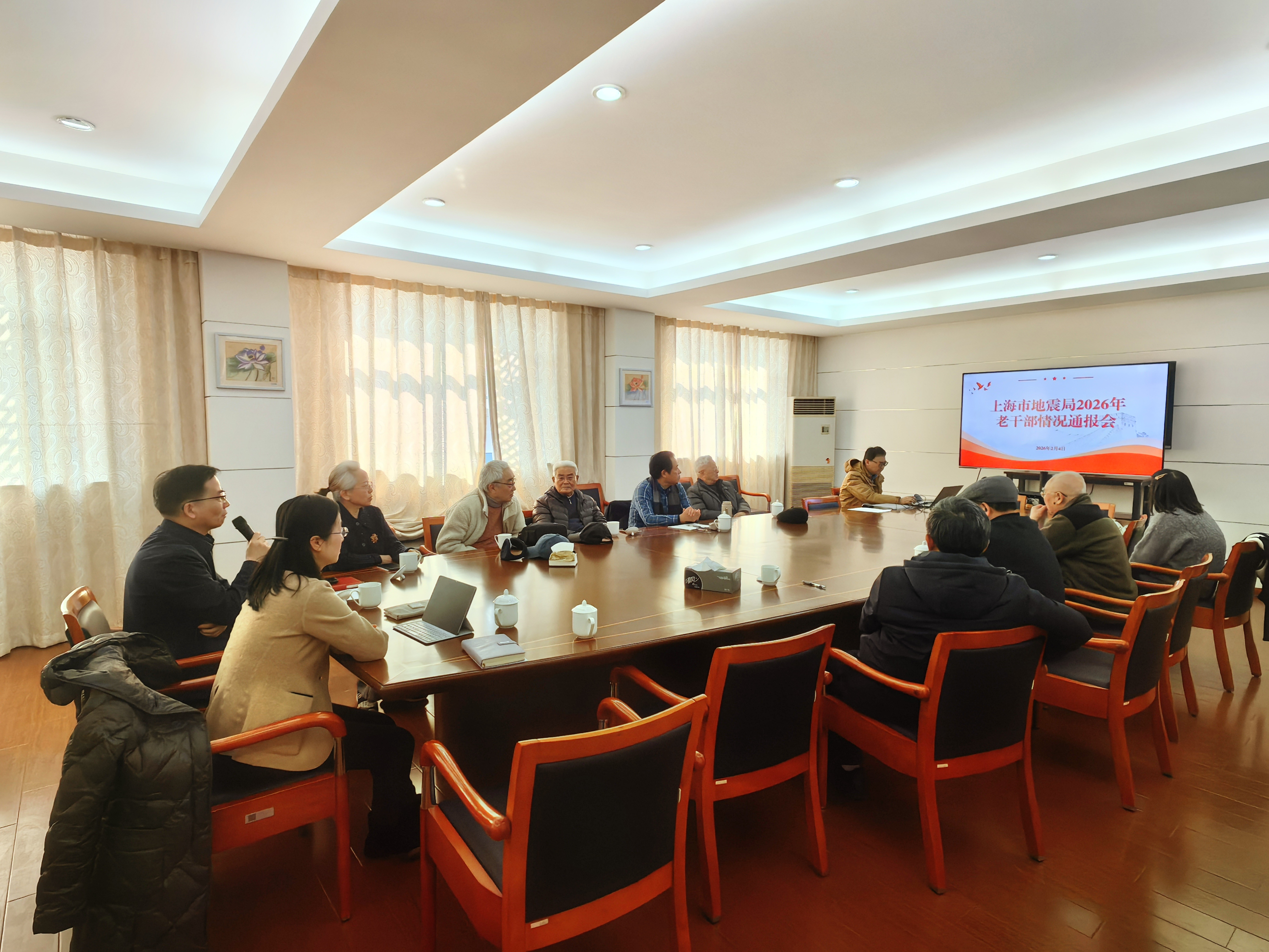 2026年2月4日上午,上海市地震局召开老同志情况通报会,局党组书记陈乃其通报了2026年全国地震局长会议精神,介绍了我局“十五五”规划推进情况,副局长孙敏震报告了2025年上海防震减灾工作情况和2026年上海防震减灾主要任务。