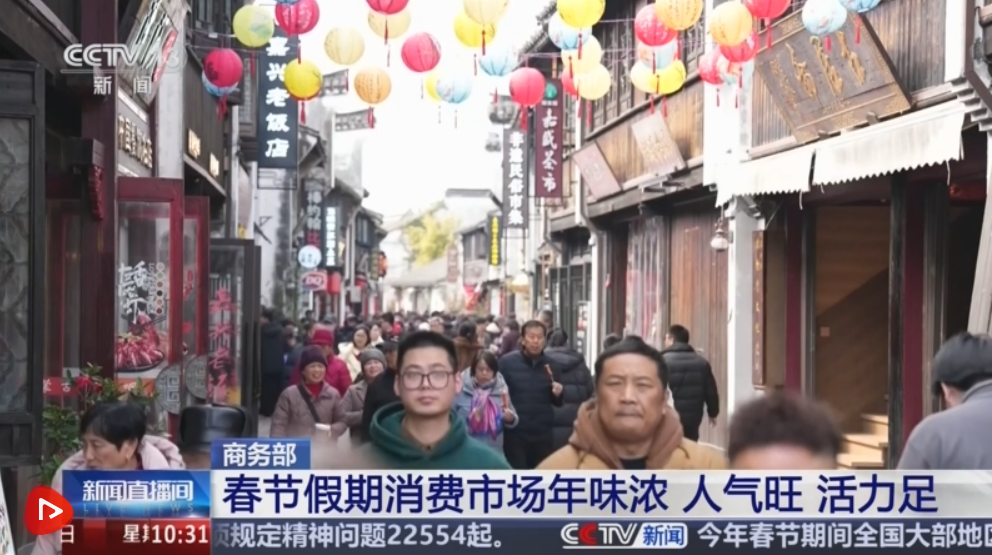 此外,这个春节,入境消费持续升温。众多外国游客来华观光购物,商务大数据显示,重点平台入境游产品订单同比增长18.4%。