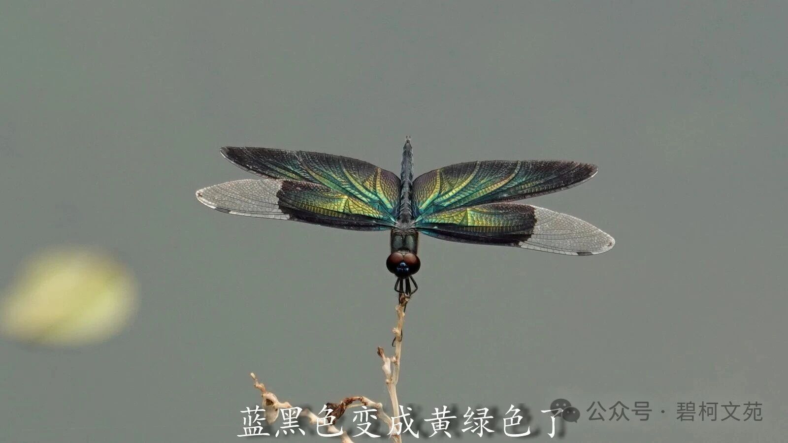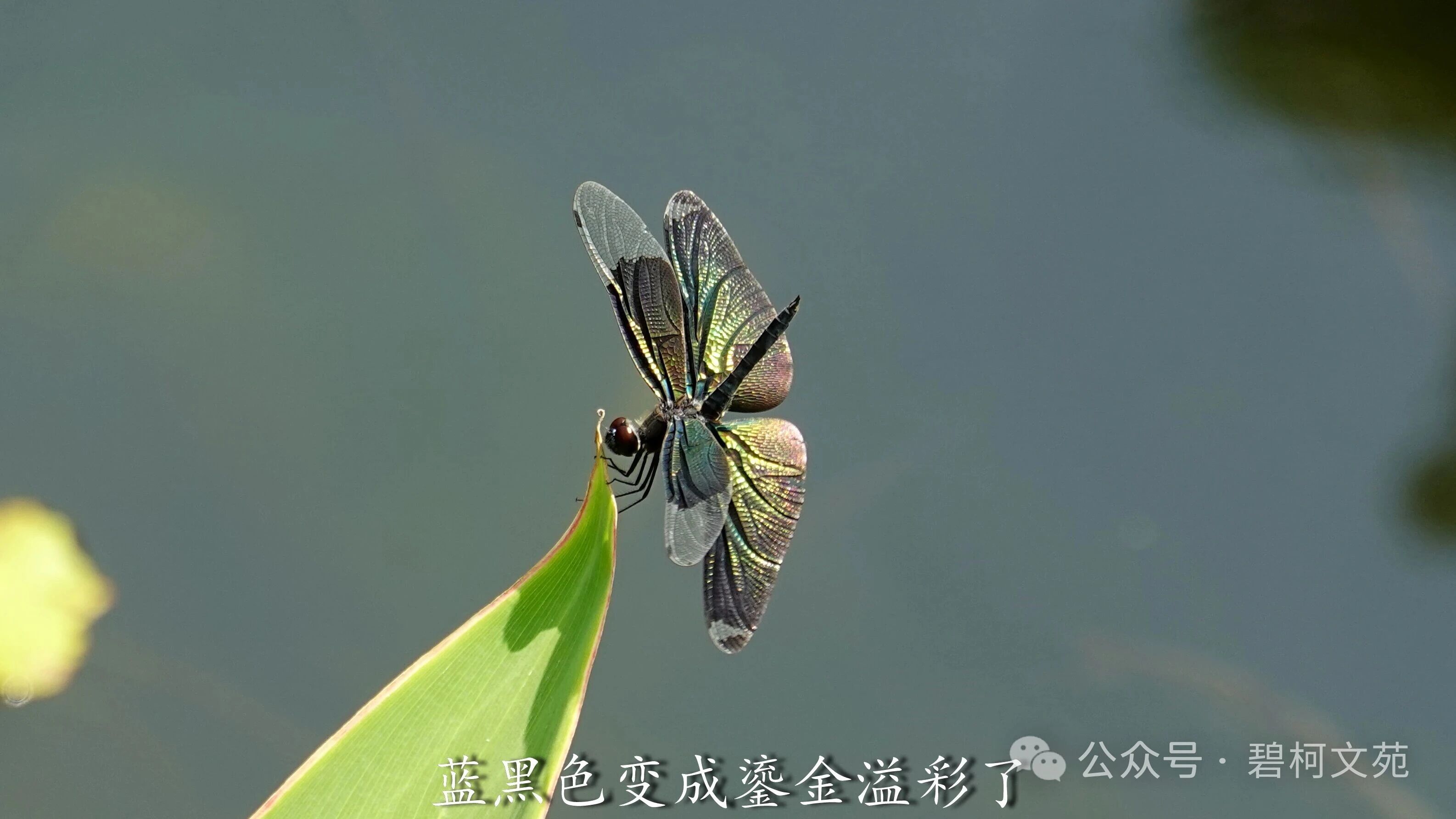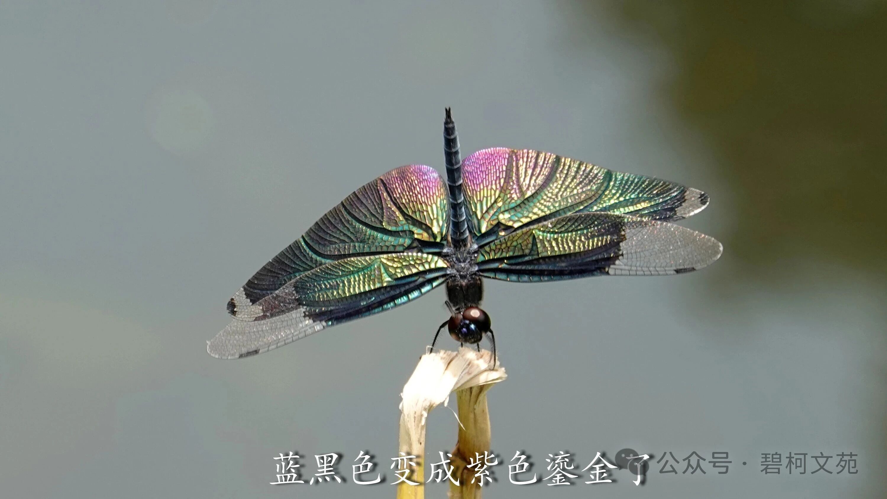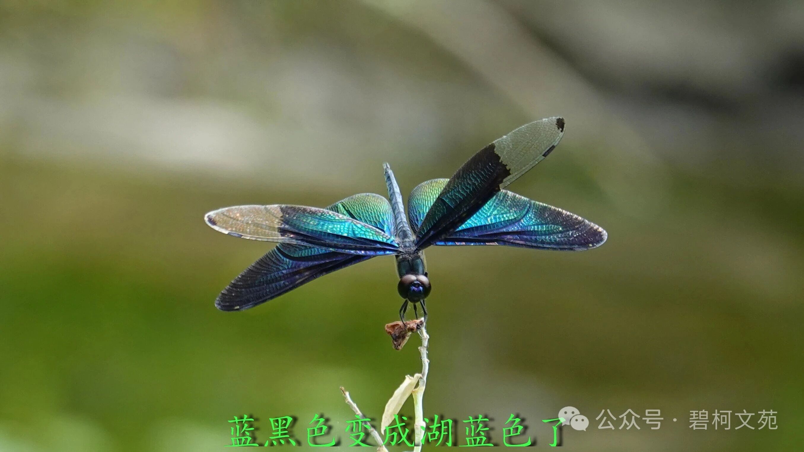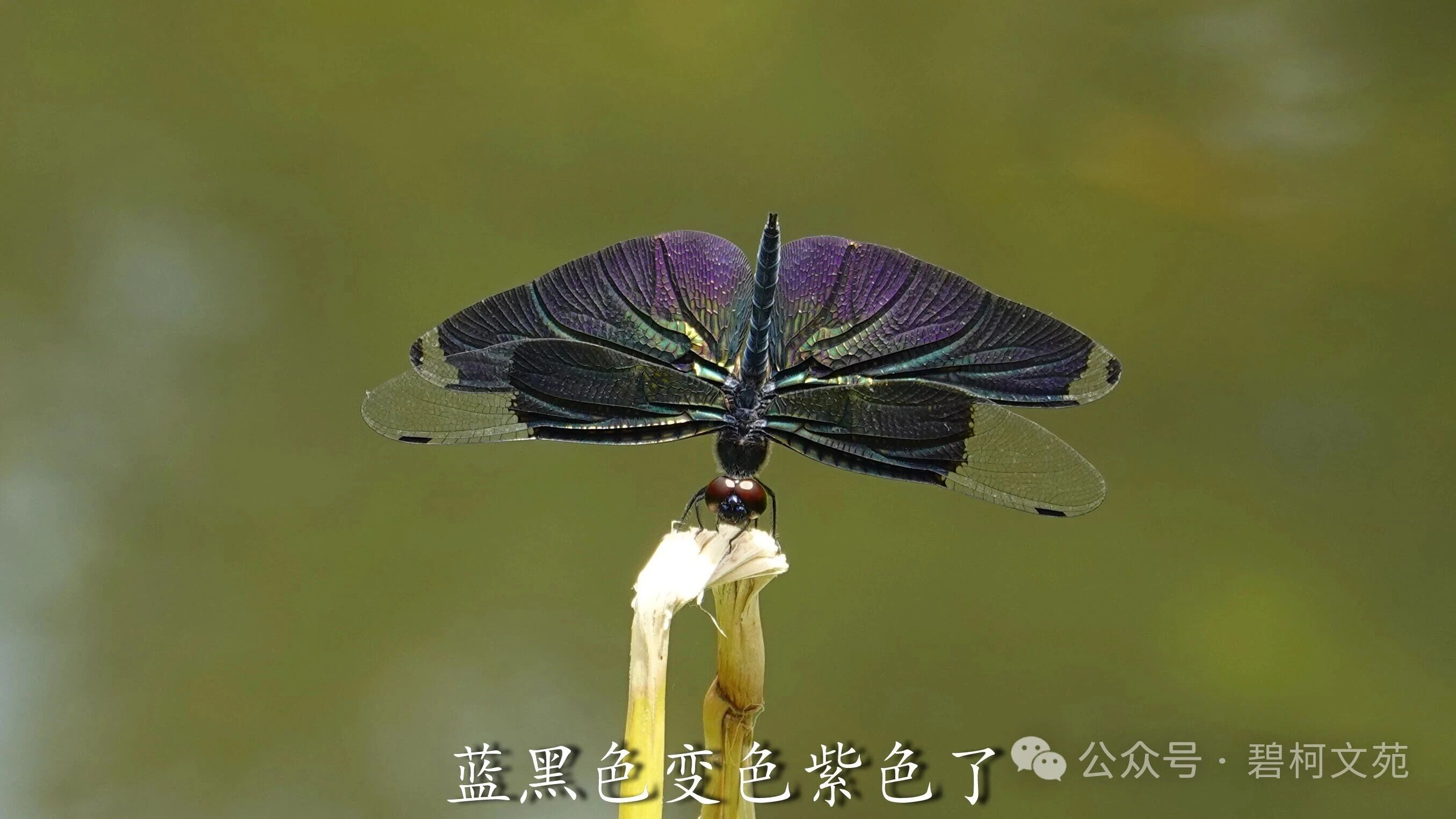 从镜头里看黑丽翅蜻,发现它们在上演川剧的变脸,小翅膀轻轻地晃动一下,或者尾巴竖起来,翅膀的颜色就变了。若不是亲眼所见,难以相信原本是蓝黑色的它们,一会蓝色,一会紫色,又一会是绿色。 这种现象让人想起孔雀和蝴蝶,它们绚丽斑斓的羽毛和翅膀非常抢眼。