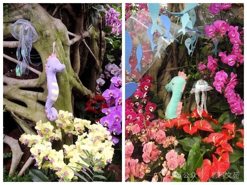 花展中陆地的马与海中的海马搭配(图15),真可谓:天马行空踏碧霄,海马潜浪逐云潮。乾坤万里皆为友,相伴山河岁月骄。