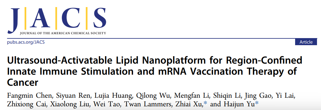 2025年8月25日,中国科学院上海药物研究所于海军课题组在Journal of the American Chemical Society上发表了题为“Ultrasound-Activatable Lipid Nanoplatform for Region-Confined Innate Immune Stimulation and mRNA Vaccination Therapy of Cancer”的研究论文并入选封面论文,该研究创新性地构建了超声响应型脂质纳米颗粒平台,其在超声刺激条件下能够时空可控地调节淋巴结内先天免疫反应激活。同时,纳米平台可普适性高效递送肿瘤抗原编码线性mRNA或环状mRNA,并在体内诱导强烈且特异的抗肿瘤免疫应答。这项研究成果展示了刺激响应型免疫佐剂策略用于增强mRNA肿瘤疫苗治疗的前景。
