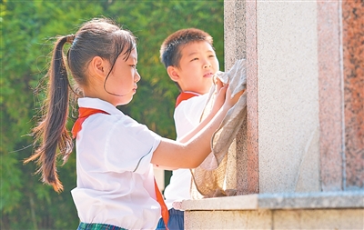 9月18日,江西吉安市小学生通过擦拭革命英雄纪念碑等方式参与纪念九一八主题活动。