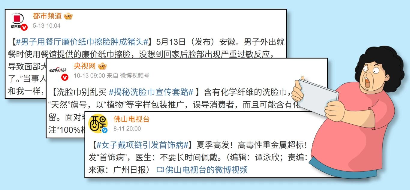 不光是护肤品,央视最近还曝光了洗脸巾产品有问题,之前也点名过卫生纸、首饰等等……