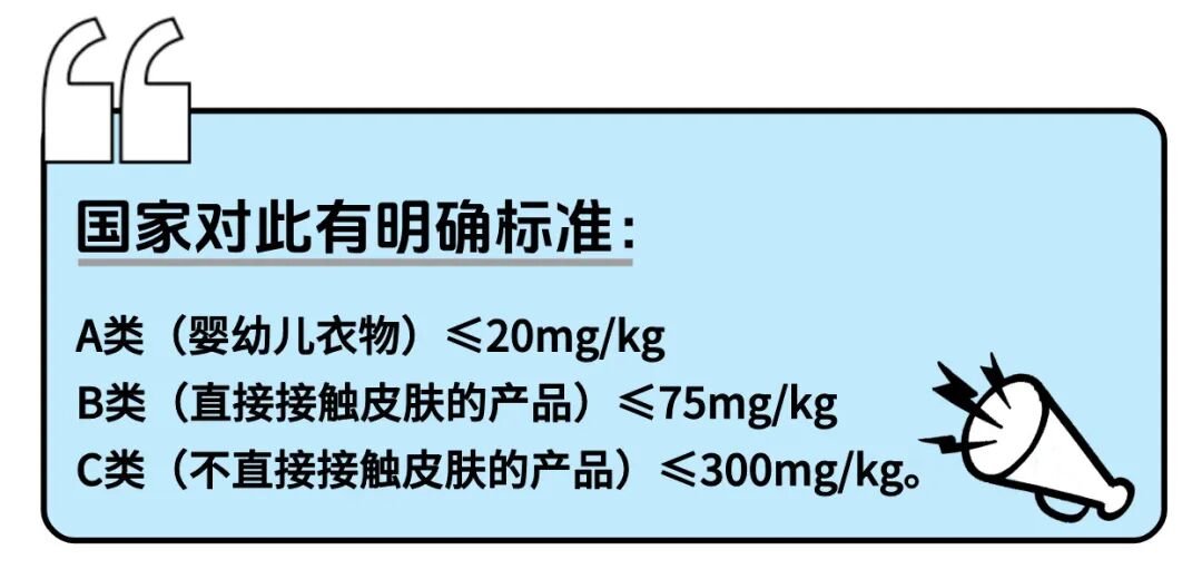 为了防皱、防缩、阻燃,或者让印花和颜色更持久、手感更好,生产过程中常常会用到甲醛,但它的含量必须控制在安全范围内。国家对此有明确标准: