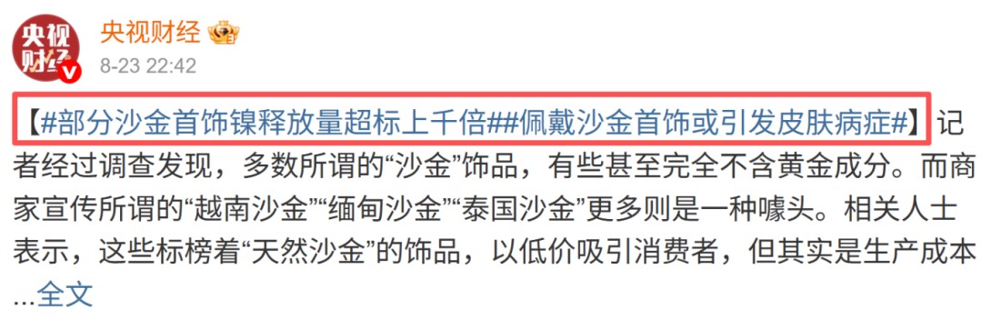 镍是一种很容易让人皮肤过敏的金属。之前,浙江杭州国际珠宝城的质检中心就检测过,发现有些“沙金”首饰里镍的释放量,竟然比国家标准高出上千倍!