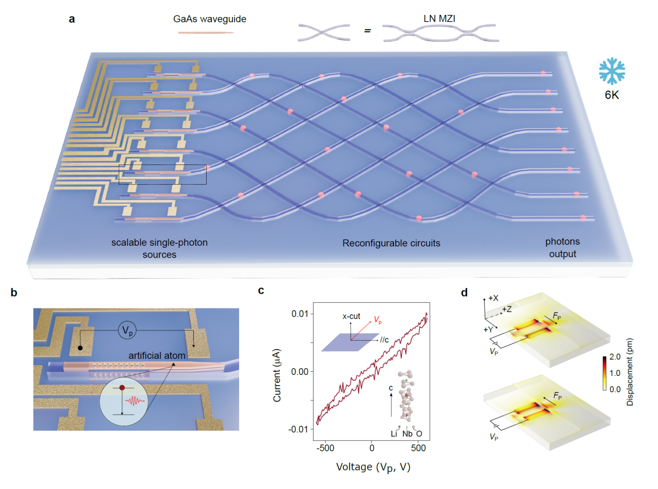 图1:(a)大规模半导体量子点-铌酸锂薄膜混合集成光量子芯片。(b)具有局域应力调控功能的混合量子点-铌酸锂集成波导。(c)低温下X-切铌酸锂薄膜直流驱动铁电畴工程实现片上局域应力。(d)铌酸锂薄膜上各项异性局域应力。