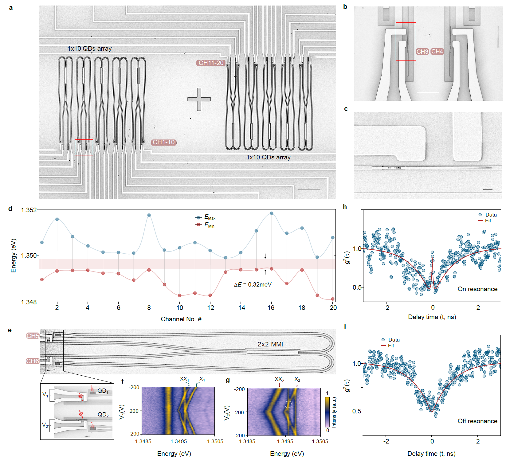 图4:(a)含20通道量子点确定性单光子源的铌酸锂混合集成光量子芯片。(b,c)量子点-铌酸锂混合集成波导扫描电子显微镜照片。(d)片上20通道量子点确定性光源的同时局域光谱调谐,局域调谐范围0.76 meV/400V,红色区域为20通道量子光源调谐后的‘同频’区域。(e,f,g)通道5和6中两个不同频量子点的同时局域调控。(h,i)片上两个波导耦合量子点的双光子共振测试。